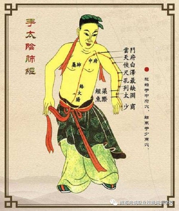 肺经自中焦的胃脘部起始,向下联络大肠,回过来沿着胃的上口,贯穿膈肌,入属肺脏,从气管、喉咙横行出于胸壁外上方,走向腋下,沿着上臂前边外侧,行于手少阴心经和手厥阴心包经的外侧,下至肘中,再沿着前臂下行,一直到桡动脉搏动的位置,沿着大鱼际外缘出拇指的侧端。